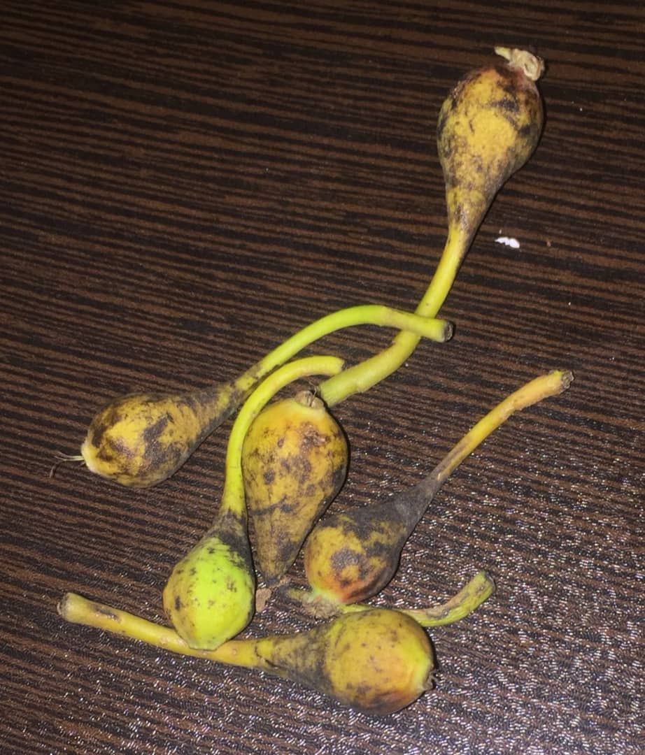 آلودگی میوه معمولا از طریق دم گل انجام می‌گیرد اما آلودگی مستقیم نیز ممکن است انجام شود. میوه نیز ابتدا آبسوخته، سپس قهوه ای، پلاسیده و خشک شده و سیاه می‌شود. میوه نابود شده نیز ممکن است برای مدت چند ماه به درخت آویزان بماند. در شرایط مرطوب، قطراتی از مایع شیری رنگ که چسبناک و محتوی باکتری هستند در سطح نقاط آلوده ظهور می‌کند. این قطرات مایع نیز معمولا پس از مجاورت با هوا قهوه ای رنگ می‌شود. قطرات گاهی با هم جمع شده در سطح نقاط آلوده به حرکت در می‌آیند و به صورت لایه ای سطح گیاه را می‌پوشاند.