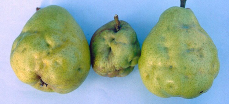 گلابی درختی بسیار حساس است و حساسترین رقم، گلابی شرقی (آسیایی) می باشد. از درختان دارای علایم ریزبرگی، کم بار، دارای علایم ناقصی روی میوه مانند تصویر فوق، ضعیف و رو به خشک شدن، کوتوله، دارای برگهای سبز چرم مانند و لوله شده به سمت بالا و درختانی که زودتر از موعد در پاییز خزان کرده اند برای تهیه پیوندک استفاده ننمایید.