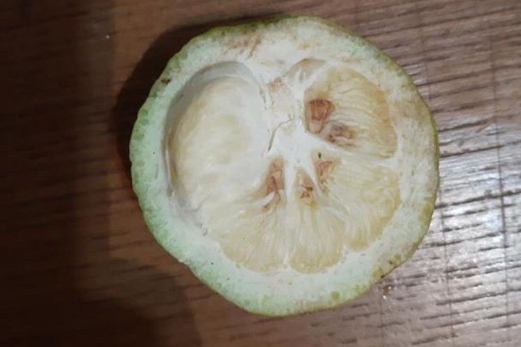 علائم بیماری به صورت کم شدن فاصله بین گره ها، رویش شاخه های فراوان از جوانه های جانبی، کوچک شدن برگها، قلبی یا فنجانی شدن آنها، عوارض شبیه به کمبود روی و ریزش برگ ها، خشک شدن برخی از شاخه ها و برگها، به گل رفتن بی موقع درخت، وجود میوه های با اندازه های متفاوت با اشکال نامتقارن روی درخت، نازا و چروکیده گشتن اکثر بذرها، نازک شدن پوست در بخش گلگاه، ایجاد لکه های به رنگ آبی در پوست سفید میوه، سبز ماندن گلگاه موقعی که بقیه قسمتهای میوه رنگ گرفته اند، کم رنگ شدن پوست و بلوطی شدن میوه همراه با کاهش شدید محصول و بیشترین رشد درختان در فصل پائیز، جلب توجه می نمایند. یک درخت به ندرت همه ی علائم بیماری را نشان می‌دهد.