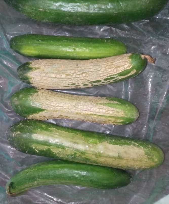 نمونه عکس ارسالی از همکار محترم؛ خسارت تریپس روی خیار که سبب دفرمگی و آثار زنگ زدگی روی خیار می شود.
