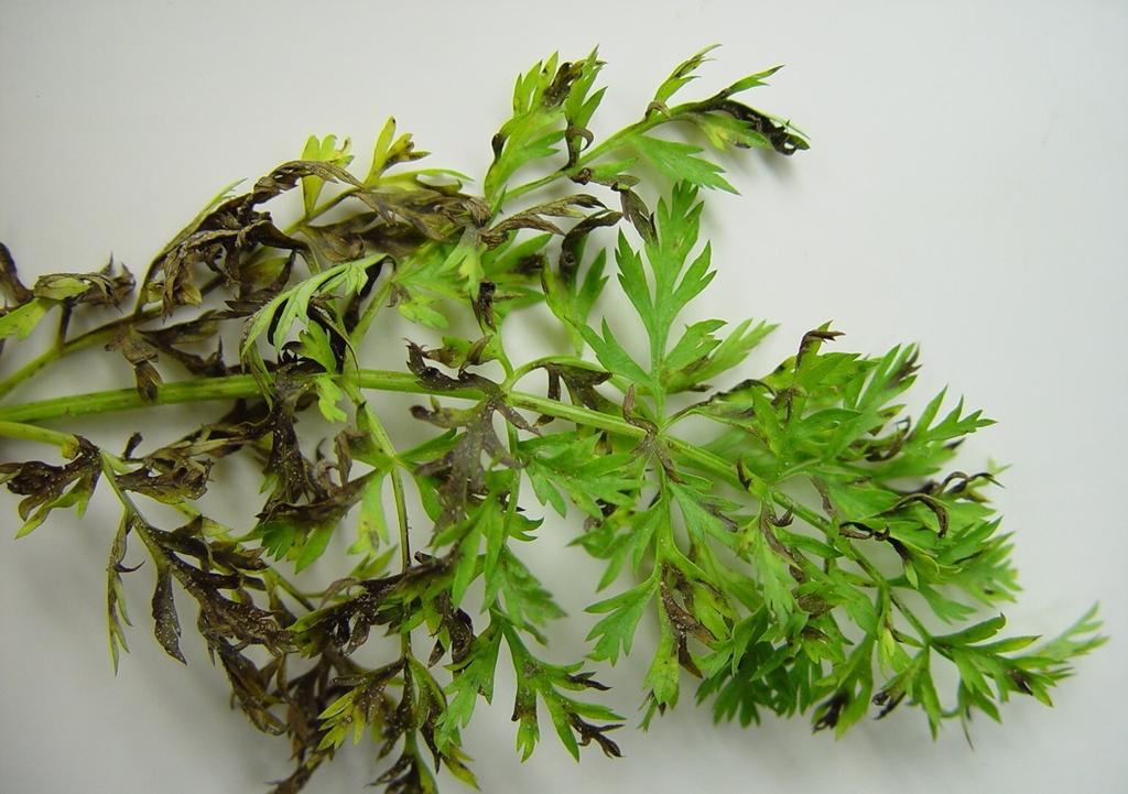ایجاد آلودگی در برگ و طوقه، بلایت برگ (ایجاد لکه‌های قهوه‌ای متمایل به سیاه در حاشیه برگ‌ها) و در نهایت پوسیدگی در ریشه هویج می‌شود، که از انتهای دمبرگ به هویج چسبیده به ریشه غده ای هویج سرایت می کند.