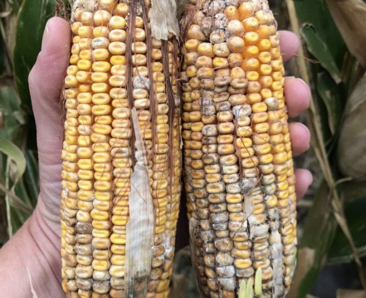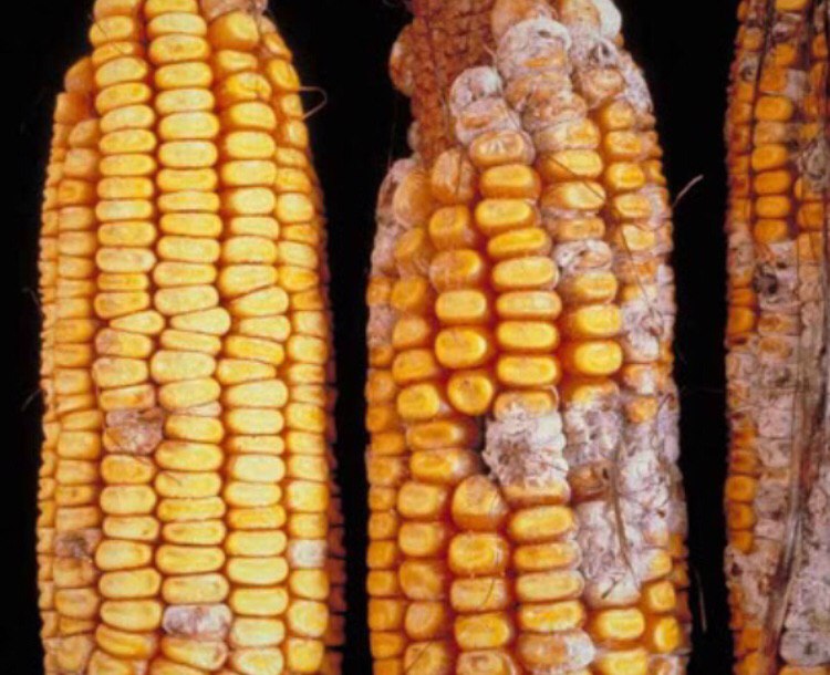 ⭕قارچ فوزاریوم که سبب ایجاد کپک سفید رنگ مایل به صورتی روی دانه های ذرت دیده می شود.