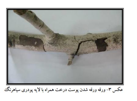 بيماري در آغاز به صورت لكه هاي كوچك سياه رنگ در سطح پوست شاخه هاي آلوده ديده ميشود (امينايي و ارشاد، 1368 .) روی شاخه هاي با قطر 3 تا 4 سانتي متر وگاهي قطورتر، نوارهای طولي به رنگ قهوهاي تيره ظاهر ميشودكه با پيشرفت بيماري و گذشت زمان، رنگ آنها سياه شاده و به علت اختلاف رنگ از قسمتهاي سالم شاخه به راحتي قابل تشخيص می باشد. بافت و پوست و چوب شاخه هادر محل شانکر و در امتداد طول شاخه، تا مغز معز چوب تیره شده به تدريج خشك ميگردد . (اشكان و همكاران، 1376.) پيشروي بيماري تا پايين ترين قسمت شاخه های قطور، تنه اصلي وگاهي اوقات تا طوقه ادامه مييابد. در مقطع عرضي و طولي شاخه هاي آلوده، بخشهای آلوده به رنگ قهوه اي تيره مشاهده ميشوند. در بعضي از موارد نيز لايه پودري سياهرنگ از اندام هاي قارچ عامال بيماري بين پريدرم و پوست تشكيل ميشود كه به راحتي قابل تشخيص می باشد. نوع ديگری از قارچ عامل بيماري در شرايط مرطوب روي پوست شاخه ها و تنه، فتيله هاي نارنجي رنگ كه شامل اسپورهاي قارچ ميباشد، تشكيل ميدهند. (حقدل ،1387 .)