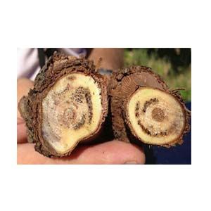 بیماری اسکا یکی از مخرب ترین بیماریهای مولد زوال انگور تقریبا در هرجایی که مو کشت می شود به شمار می آید.علایم بیماری روی برگها به صورت لکه کلروتیک بین رگبرگ ها ظاهرمیشود که پس از مدتی نکروزه شده و حالت سوختگی بین رگبرگ ایجاد شده و حالت پوست ببری پیدا میکند.تخریب چوب همراه پوسیدگی سفید شامل نقاط کوچک قهوه ای تا سیاه رنگ در مقطع عرضی تنه و در مقطع طولی تنه به صورت خطوط طولی سیاه رنگ مشاهده می شود.روی درختان انگور هشت سال ب بالا علایم پوسیدگی سفید را در مغز تنه می توان مشاهده کرد ک به تدریج چوب سخت تنه نرم،شکننده و اسفنج میشود.روش درمانی مناسب برای بیماریهای تنه انگور وجود ندارد.برخی تحقیقات در خصوص تزریق قارچکش به داخل تنه انگور انجام شده است ولی بخاطرگرانی و افزایش هزینه کارگری و همچنین تاثیر کم آن قابل توصیه نمی باشد. بنابراین جهت درمان این بیماری باید توجهات بروی برنامه های مدیریتی کاهش گسترش آلودگی تمرکز یابد. دراین مورد سه اصل محافظت زخمهای حاصله از هرس برای جلوگیری از رشد میسلیوم قارچها و همچنین بستن راههای فیزیکی برای جلوگیری از آلودگی تنه، روشهای کنترل باغی شامل سوزاندن بقایای هرس و زمان مناسب هرس (ضمنا نباید هرس در زمان بارندگی صورت گیرد) و بالاخره کاهش استرس ها از جمله آبیاری به موقع و تغذیه مناسب میتواند نقش مهمی در کاهش این بیماری داشته باشد.